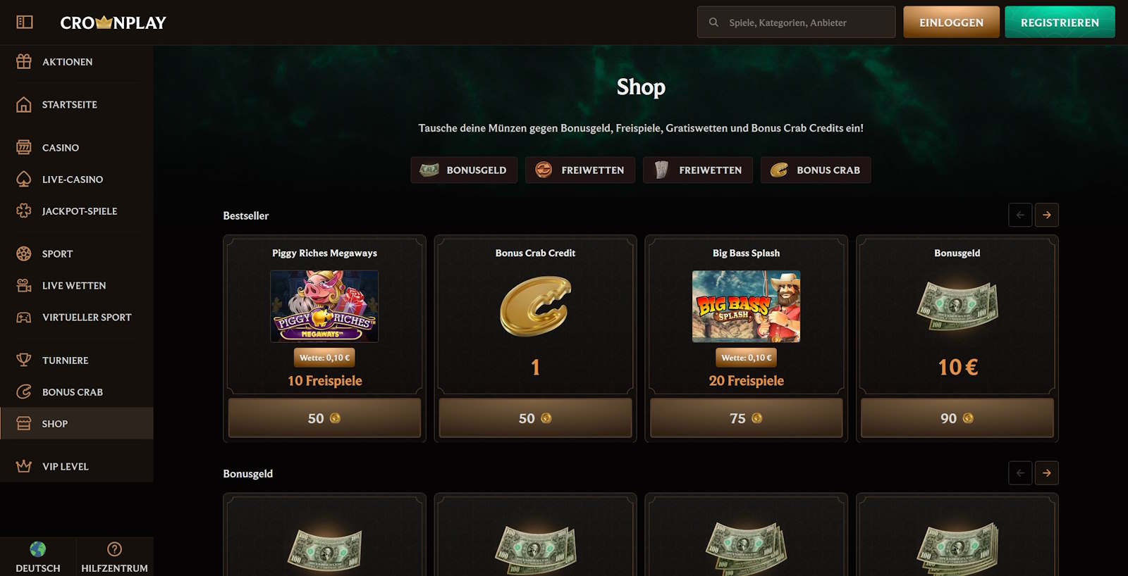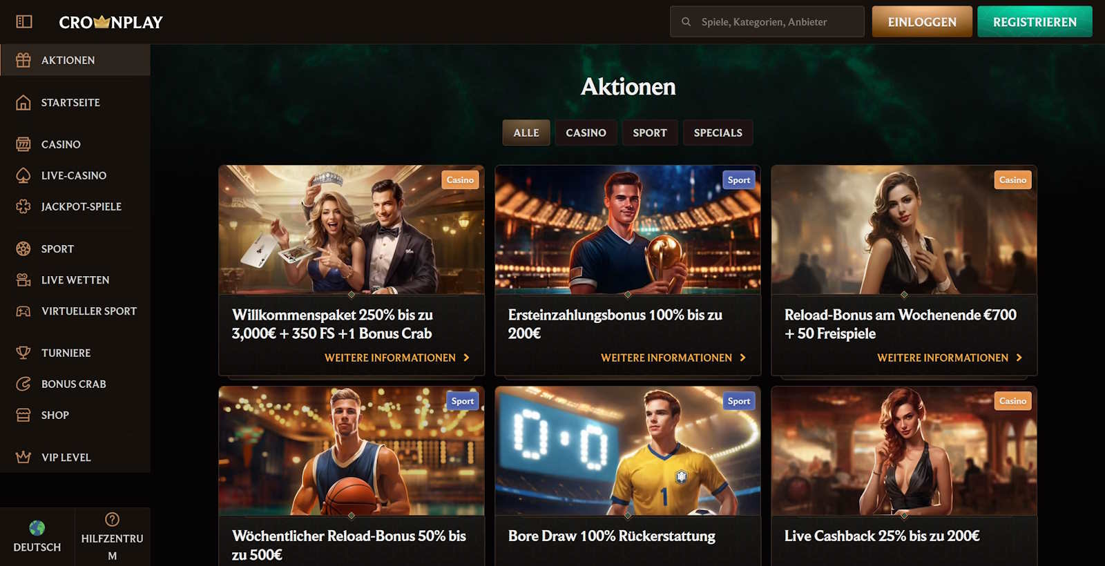 Im CrownPlay Casino spielen Sie alle Casinospiele ohne Einschränkungen und Pausen. Sichern Sie sich bis zu 3000 € Willkommensbonus, 350 Freispiele sowie einen BonusCredit und starten Sie mit Echtgeld ab 20 € Mindesteinzahlung durch.