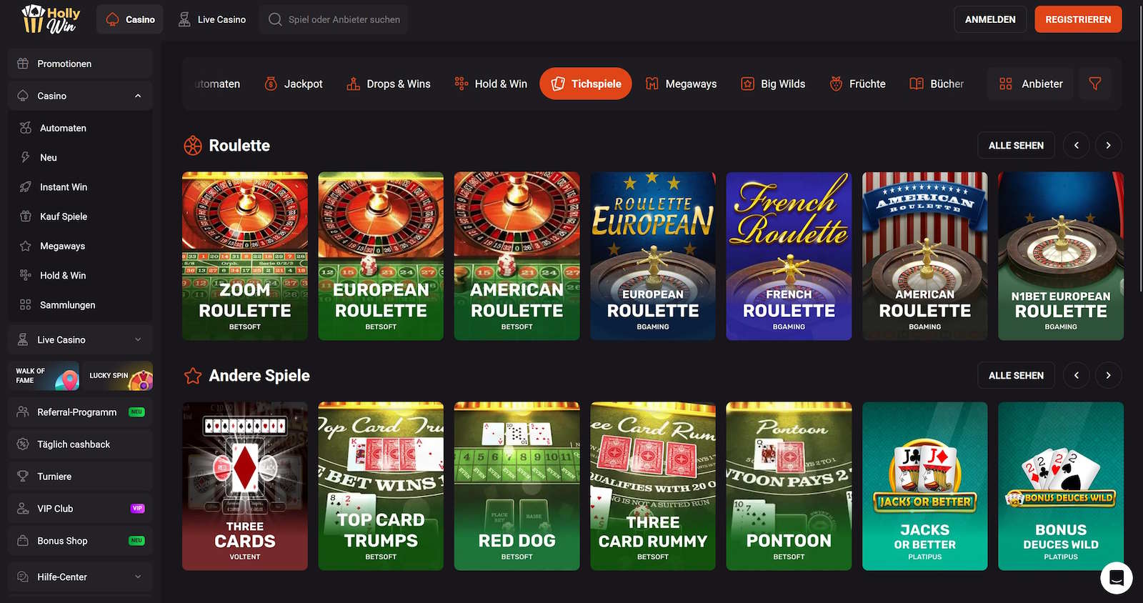 Im HollyWin Casino spielen Sie alle Casinospiele ohne Limits und Pausen online. Sichern Sie sich jetzt den 4-fachen Bonus bis zu 15.000 € + 350 Free Spins, und starten Sie mit Echtgeld ab 20 € Mindesteinzahlung durch.