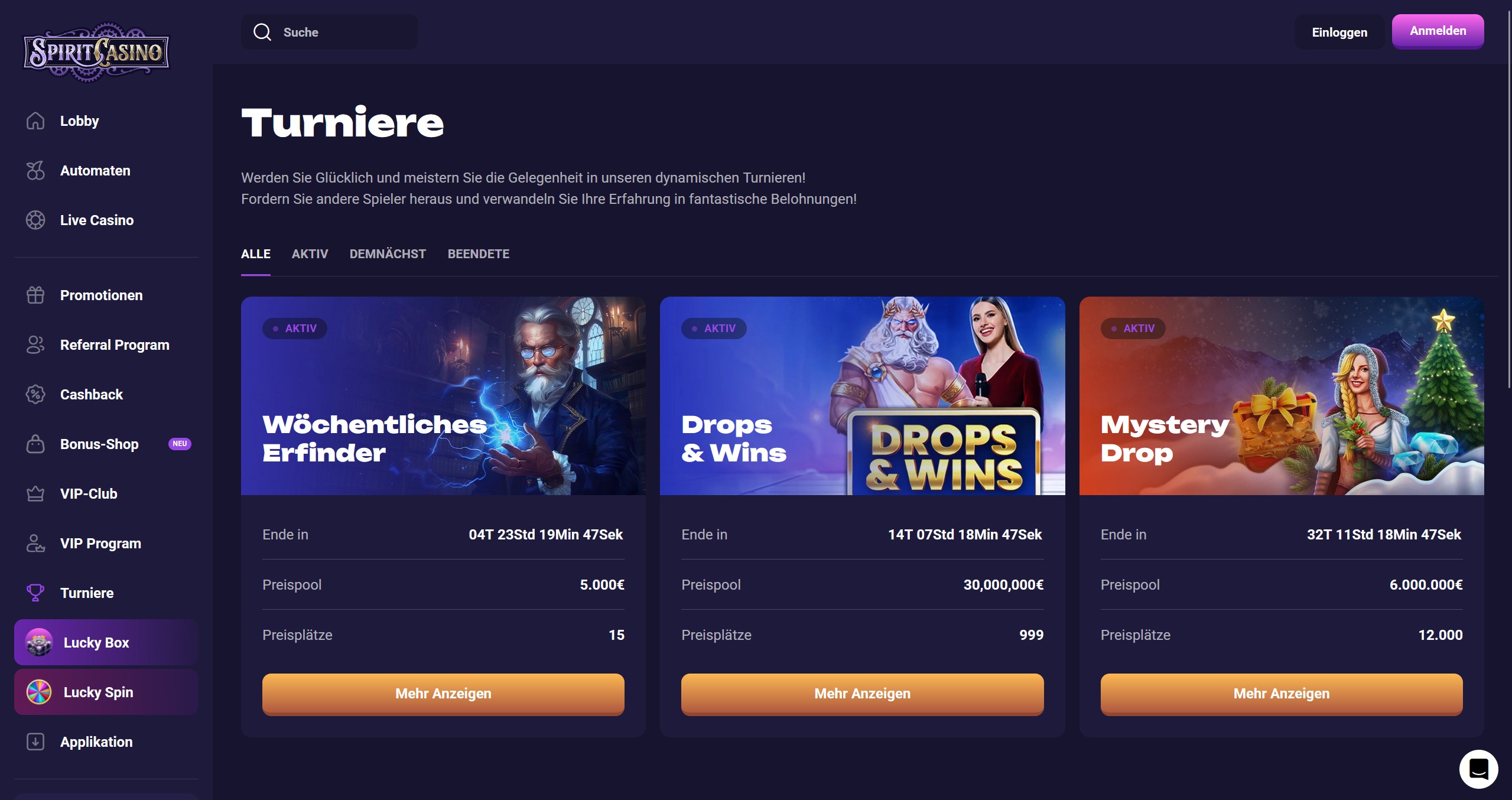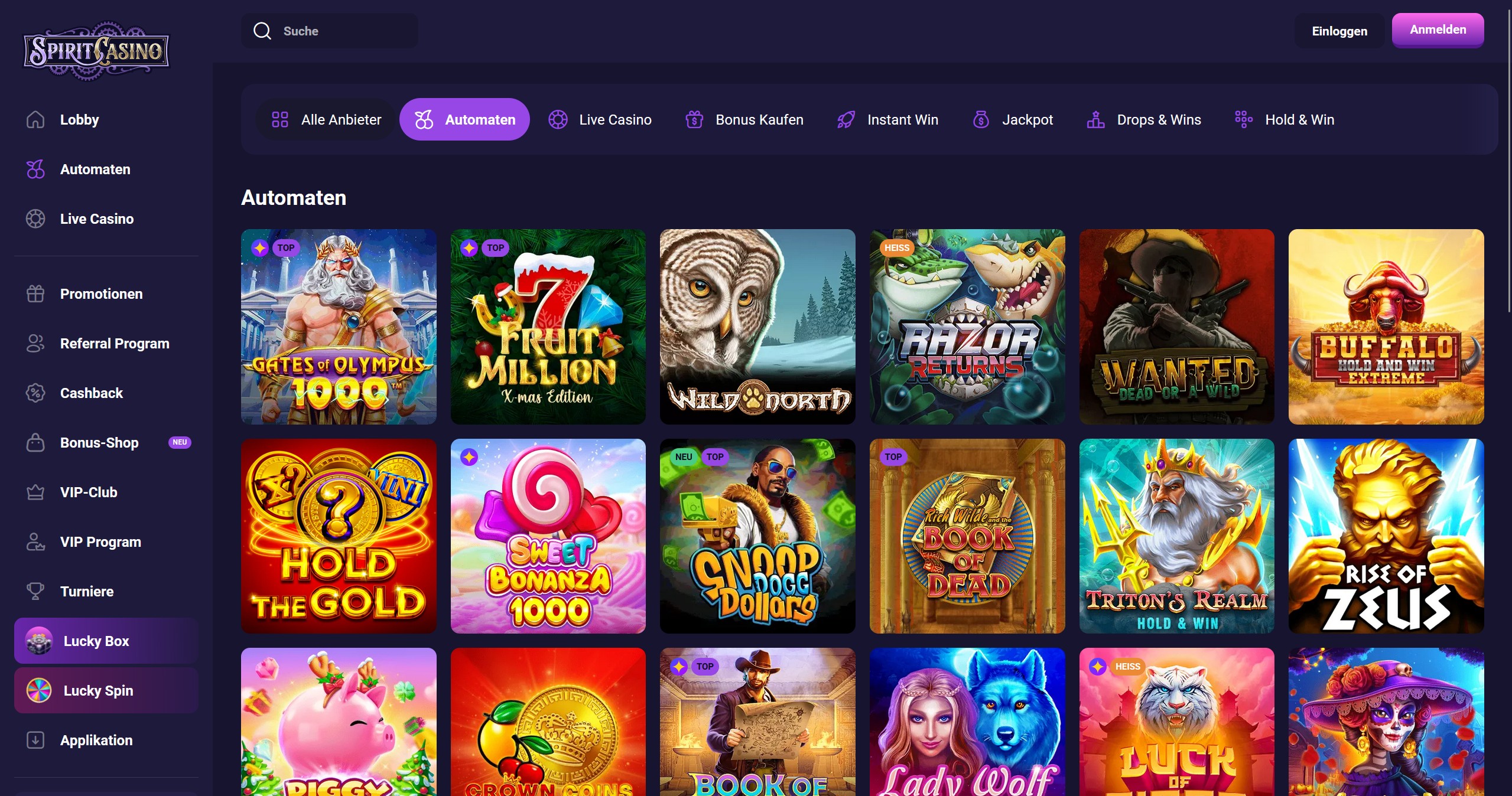 Im Spirit Casino spielen Sie alle Casinospiele ohne Limits und Pausen. Sichern Sie sich jetzt 100% Bonus bis zu 2000 € + 200 Free Spins und starten Sie mit Echtgeld ab 20 € Mindesteinzahlung durch.