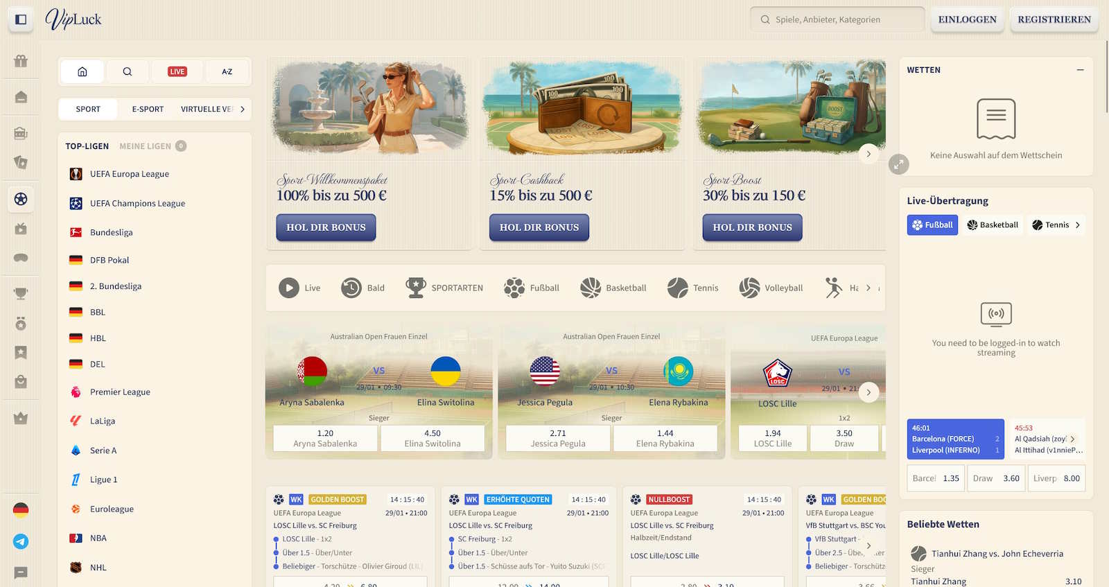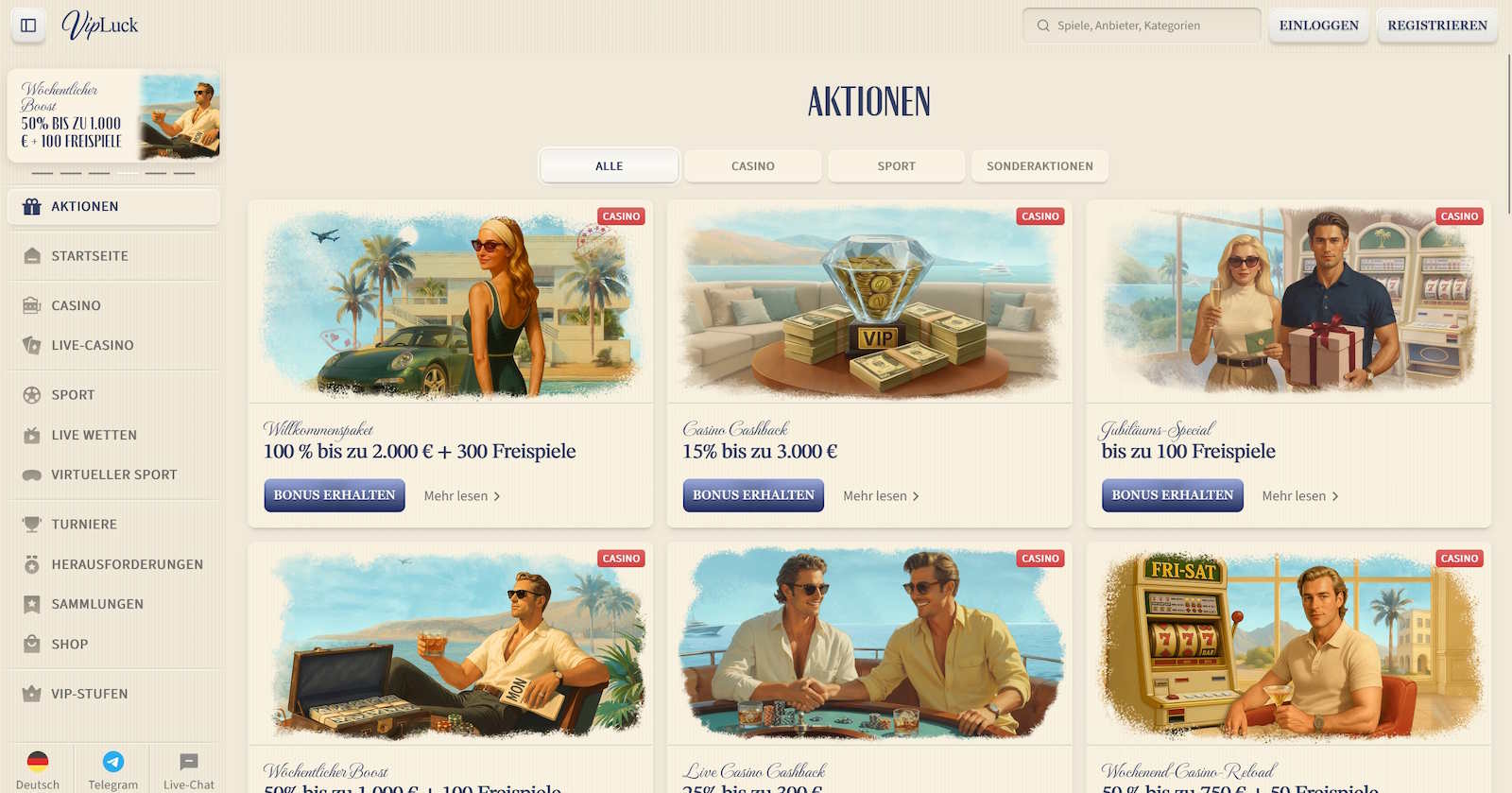 Im VIPLuck Casino spielen Sie alle Casinospiele ohne Limits und Pausen online. Sichern Sie sich jetzt bis zu 2000 € Bonus + 300 Free Spins, und starten Sie mit Echtgeld ab 20 € Mindesteinzahlung durch.